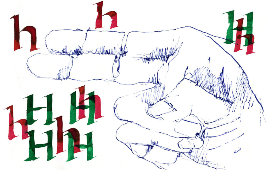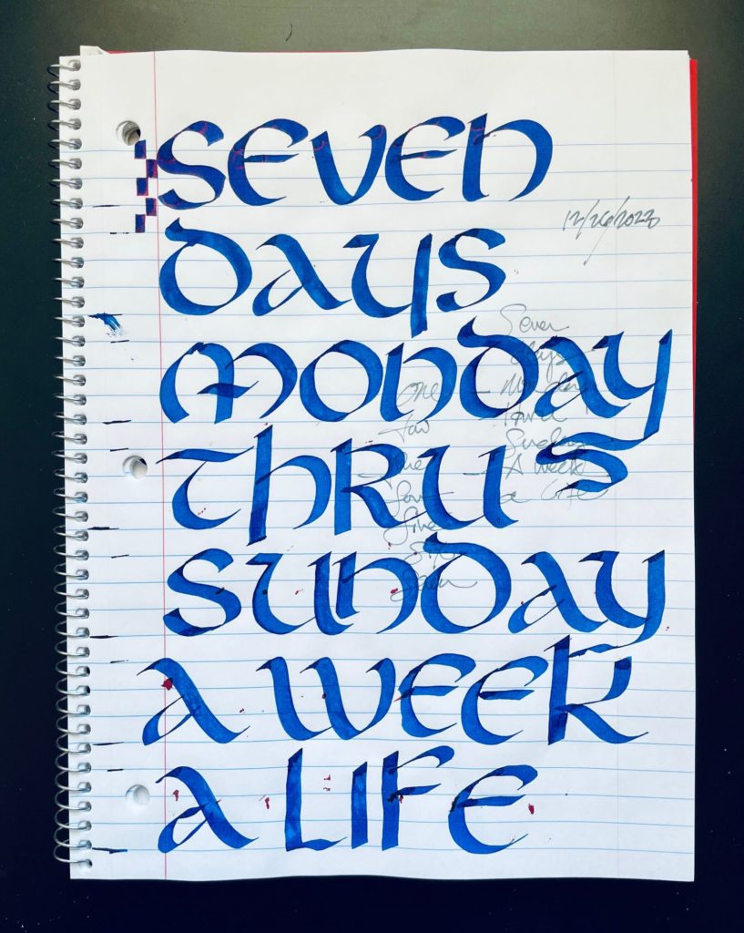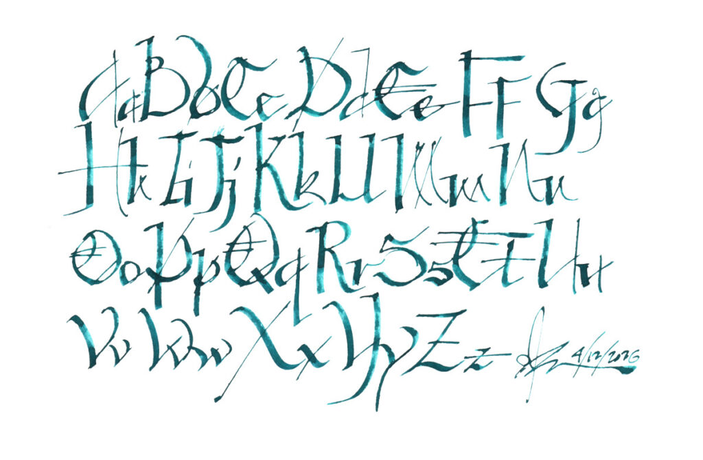 This week I started playing with a variant of Gothicized Italics where part of each letter is written with the hairline edge of the pen. It’s a bit of Edward Johnston slamming into graffiti scripts.
