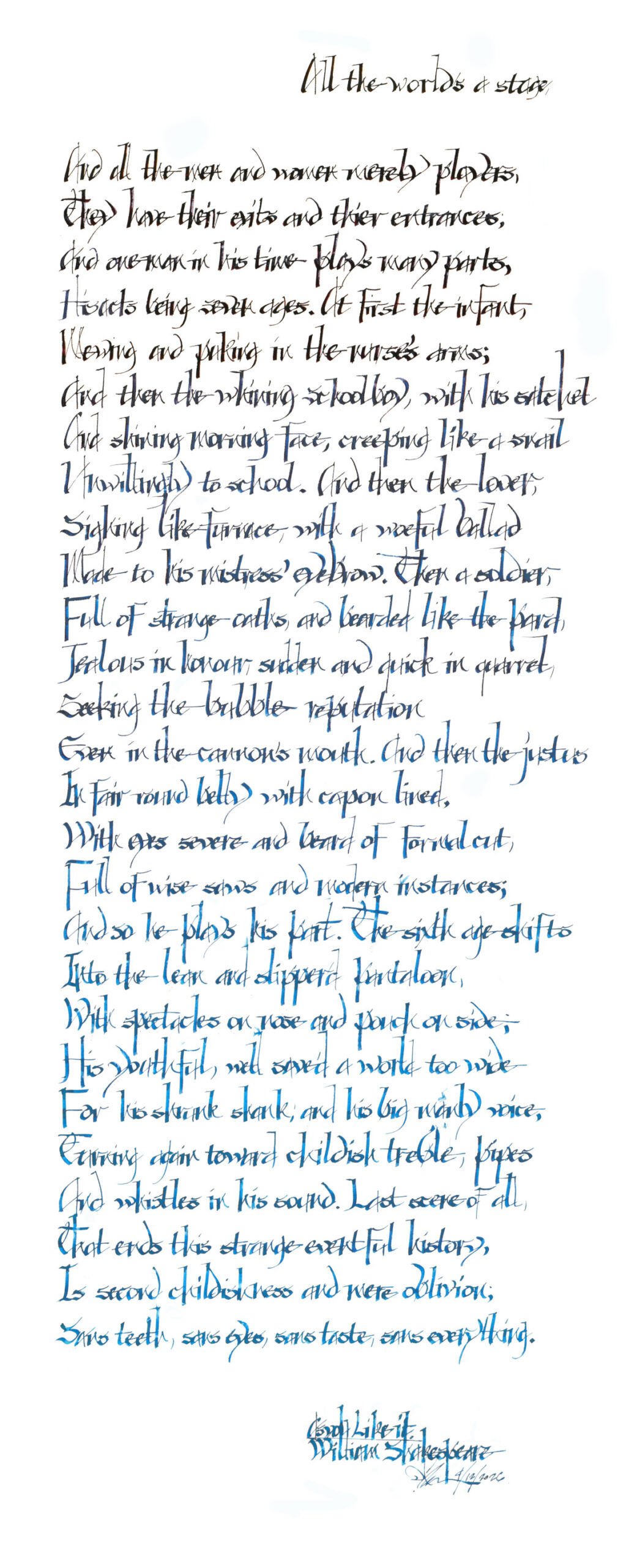 All the world’s a stage, And all the men and women merely players; They have their exits and their entrances; And one man in his time plays many parts, His acts being seven ages. At first the infant, Mewling and puking in the nurse’s arms; And then the whining school-boy, with his satchel And shining morning face, creeping like snail Unwillingly to school. And then the lover, Sighing like furnace, with a woeful ballad Made to his mistress’ eyebrow. Then a soldier, Full of strange oaths, and bearded like the pard, Jealous in honour, sudden and quick in quarrel, Seeking the bubble reputation Even in the cannon’s mouth. And then the justice, In fair round belly with good capon lin’d, With eyes severe and beard of formal cut, Full of wise saws and modern instances; And so he plays his part. The sixth age shifts Into the lean and slipper’d pantaloon, With spectacles on nose and pouch on side; His youthful hose, well sav’d, a world too wide For his shrunk shank; and his big manly voice, Turning again toward childish treble, pipes And whistles in his sound. Last scene of all, That ends this strange eventful history, Is second childishness and mere oblivion; Sans teeth, sans eyes, sans taste, sans everything.