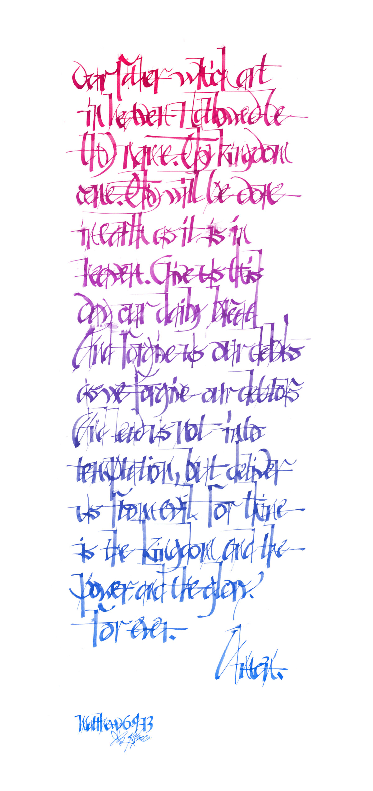I’m still infatuated with this script, even though both the Girl and Mama find it illegible. This one was graphed over 4 sheets and stitched together in GIMP. Unlike the Lord’s Prayer from the week before, I had switched inks before start this piece, so there is a slight natural gradation in the actual piece, which is pushed further in the computer.