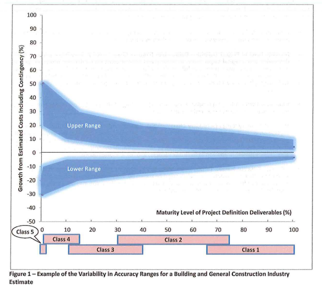A while ago, I had pondered the question about desired accuracy for a project estimate. With a little research, I found a professional society who studied that exact problem—the Association for the Advancement of Cost Engineering (AACE). In their rubric, the roughest estimates are categorized “Class 5” with an 80% confidence of landing between -30% to +50% for construction projects (AACE 56R-08, adopted in ASTM E2516).